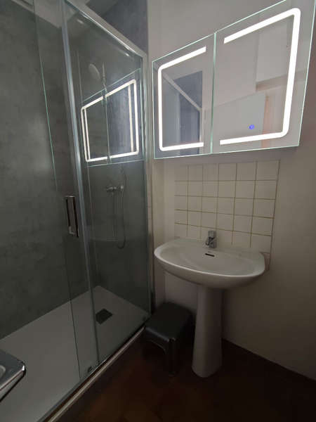 Grande pièce de vie avec cuisine ouverte aménagée et Equipée (plaque, hotte, four) salle d'eau et WC séparé. Disponible