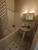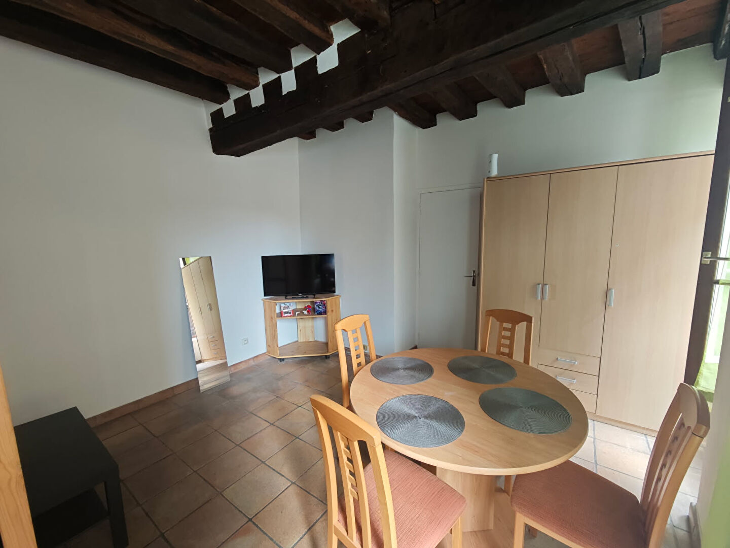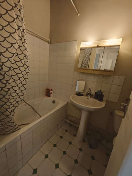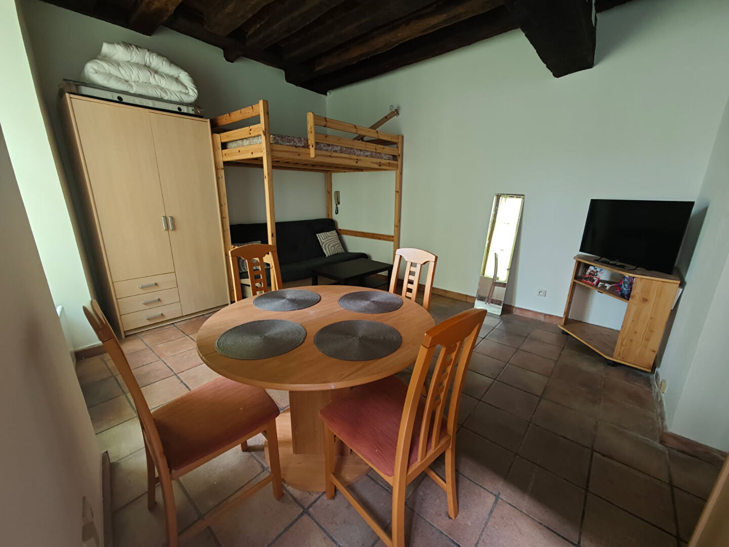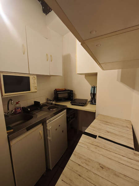 Appartement meublé comprenant une cuisine aménagée et équipée (réfrigérateur-congélateur, micro-onde, plaques de cuisson), une salle de bain avec wc et une pièce principale.