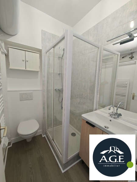 Face à la gare, deux pièces comprenant pièce principale avec cuisine us aménagée (hotte, plaques, four), une chambre, salle d'eau avec wc Place de parking Eau froide dans les charges. Disponible